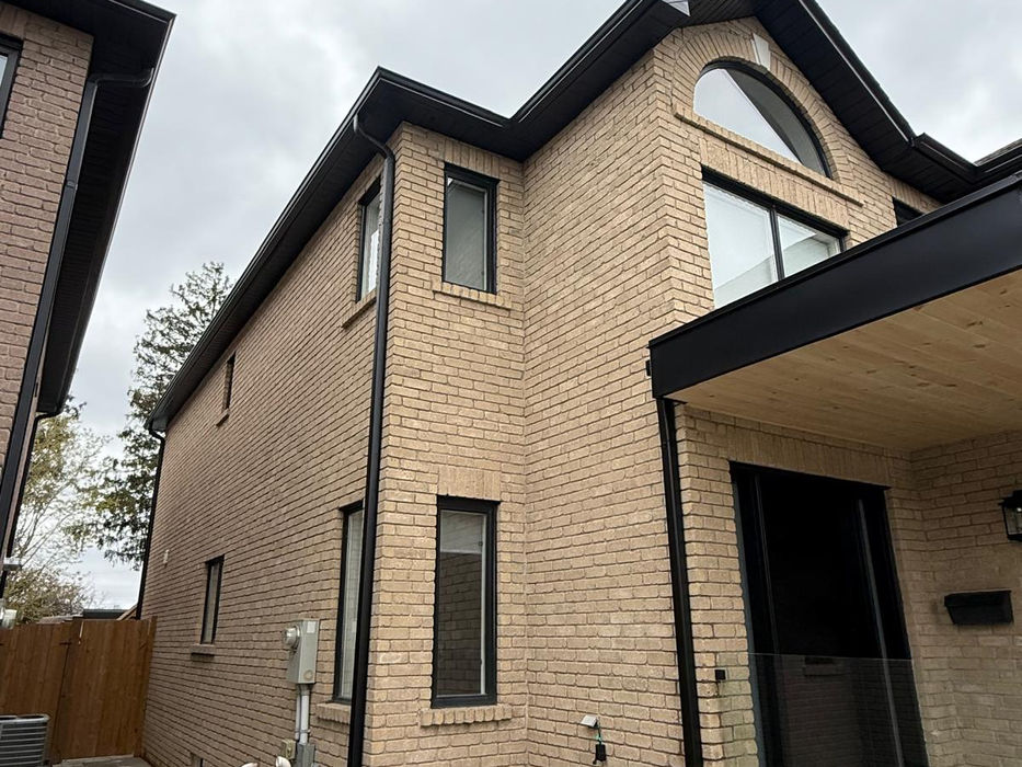 This project in Vaughan, Ontario included a full exterior upgrade with the installation of eavestroughs, downpipes, soffit, fascia, and new black aluminum columns, delivering both improved performance and a striking visual transformation.